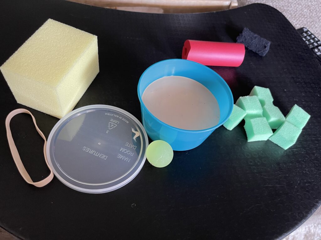Because of my nerve damage, my fine motor skills need strengthening. Every “toy” is focused on that. The immediate goal is that I make a fist by week 12. That will determine if a 2nd surgery is needed to break through scar tissue.